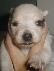 DOB: 8/17/2002This breeding wasn't planned until some time NEXT year but nobody told Ollie that. One morning I was not careful enough about who was let out with whom and despite QUICK realization of my error a little puppy lust took place before I could get Ollie back in the house. "Peanut" was a teeny-tiny puppy that weighed only 5 oz at birth but she has made it so far and is already a little pistol ! | ![]() |
